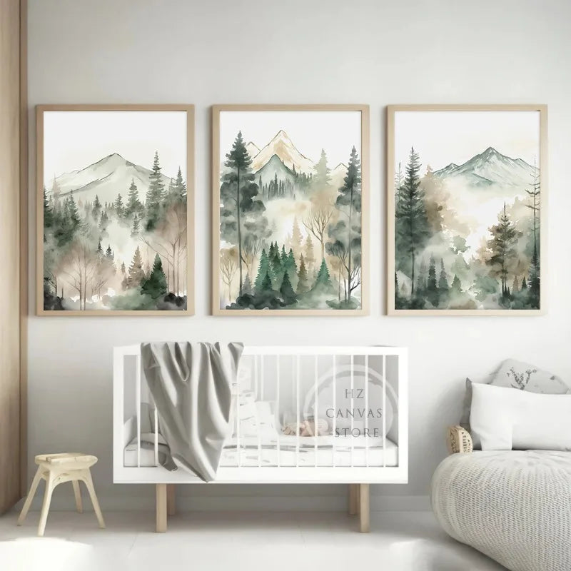 Chaque affiche présente un paysage de forêt captivant, réalisé avec des techniques de peinture à l'eau qui mettent en valeur des nuances de vert sauge et de beige. Ce choix de couleurs douces et naturelles est parfait pour un style moderne, scandinave ou nordique, apportant une touche de fraîcheur et de douceur à vos murs. Imaginez un grand mur de votre salon orné de ces magnifiques paysages, créant ainsi un point focal à la fois apaisant et inspirant, où la nature semble s'inviter chez vous.