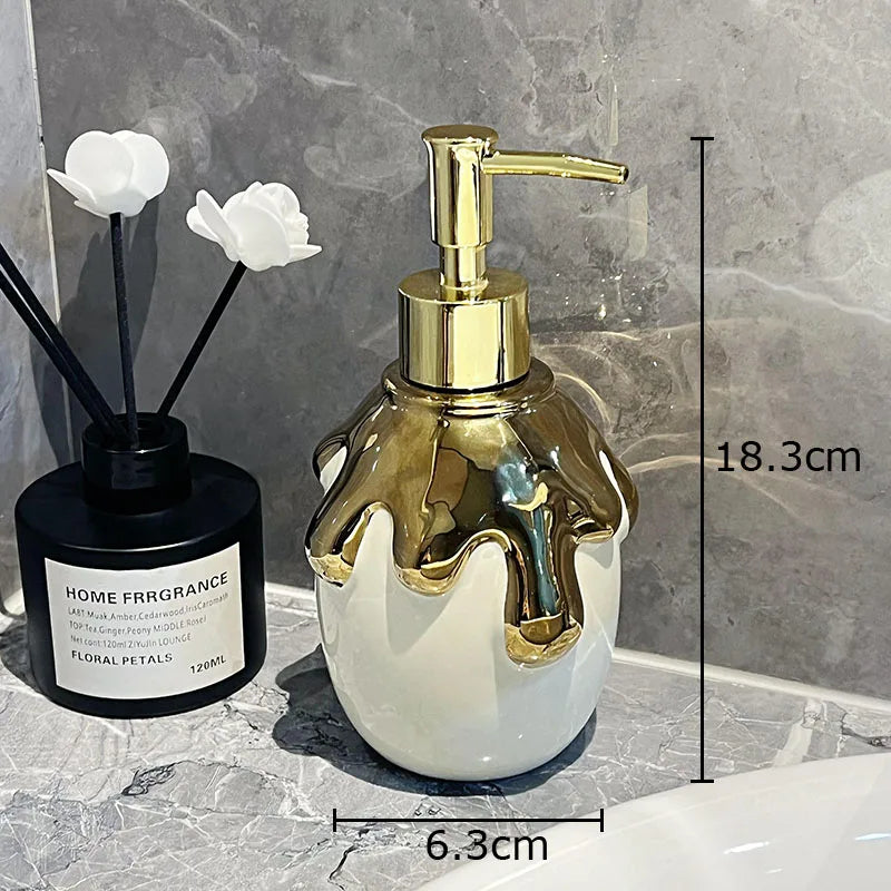 Ajoutez une touche d'élégance et de sophistication à votre salle de bain avec notre distributeur de savon en céramique dorée. Ce magnifique accessoire est bien plus qu'un simple contenant ; il est une véritable pièce maîtresse qui allie fonctionnalité et design. Fabriqué en céramique de haute qualité, ce distributeur arbore une finition dorée éclatante qui apportera une note de luxe à votre espace.