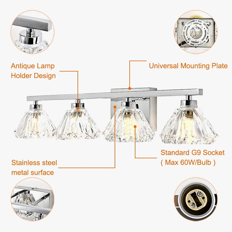 La Lampe de salle de bains en cristal moderne utilise des ampoules LED, connues pour leur efficacité énergétique et leur longue durée de vie. Avec quatre sources lumineuses, cette lampe est capable d'éclairer une superficie de 10 à 15 mètres carrés, ce qui en fait le choix idéal pour les grandes salles de bains, les chambres ou les bureaux. Malgré sa puissance, cette lampe n'est pas dimmable, garantissant ainsi une luminosité constante et fiable.