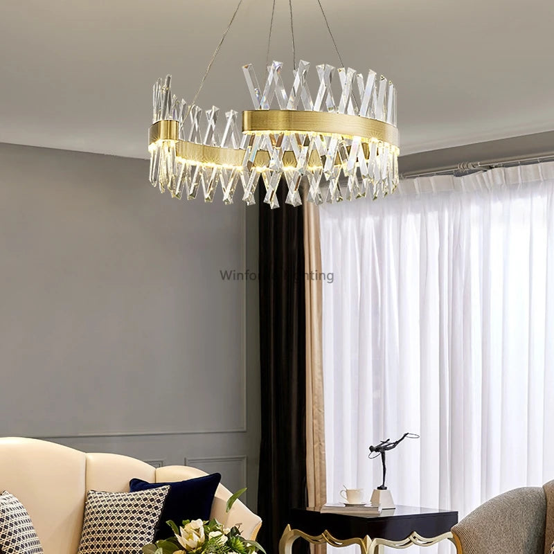 Ce lustre en cristal Winfordo WF-XD009 est une véritable déclaration de style. Son design moderne est rehaussé par une finition dorée et des détails en cristal qui scintillent magnifiquement à la lumière. Le lustre est suspendu par un cordon, ce qui ajoute une touche d'élégance et de sophistication.