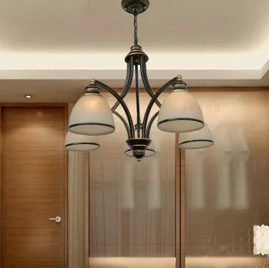 Ce lustre est conçu pour s'adapter à divers environnements. Son style vintage et son matériau en fer forgé, associé à un abat-jour en verre dépoli, permettent une diffusion douce et chaleureuse de la lumière. Imaginez-le suspendu au-dessus de votre table à manger, créant une atmosphère intime lors de vos dîners en famille ou entre amis. Dans le salon, il peut ajouter une note de sophistication, tandis que dans une chambre, il offre une ambiance relaxante propice à la détente.