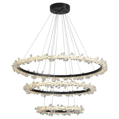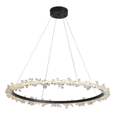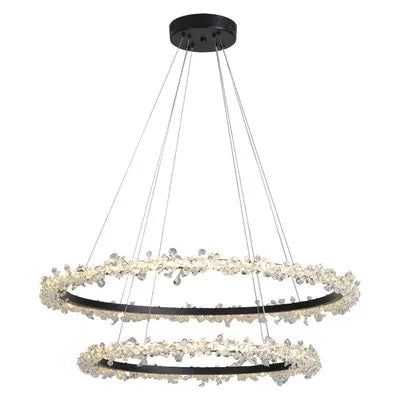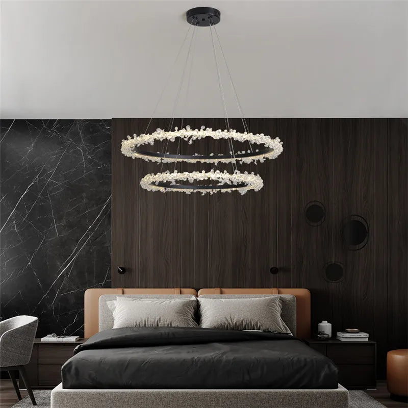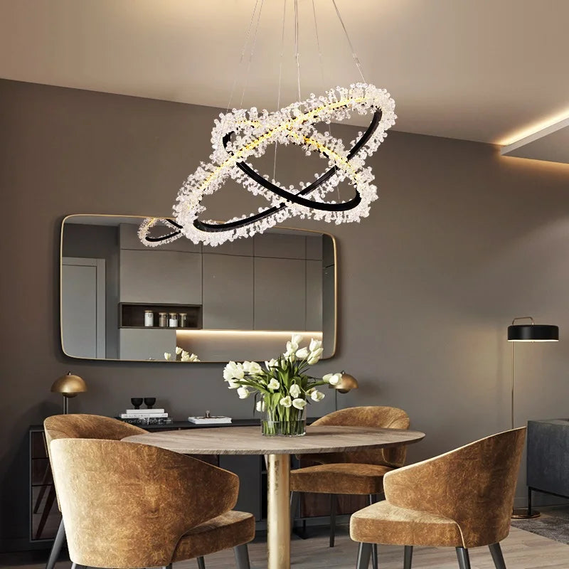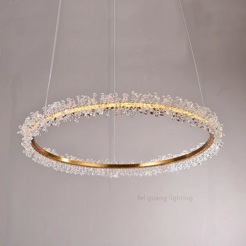 Cette suspension en cristal est idéale pour des pièces allant de 10 à 15 m². Sa conception en forme d'anneau, ornée de délicats cristaux, diffuse une lumière douce et apaisante, parfaite pour les moments de détente en famille ou entre amis. Imaginez-vous assis autour d'une table, la lumière scintillante de ce luminaire créant une atmosphère intime lors d'un dîner. Dans le salon, elle devient le point focal d'une décoration moderne, attirant les regards et suscitant l'admiration.